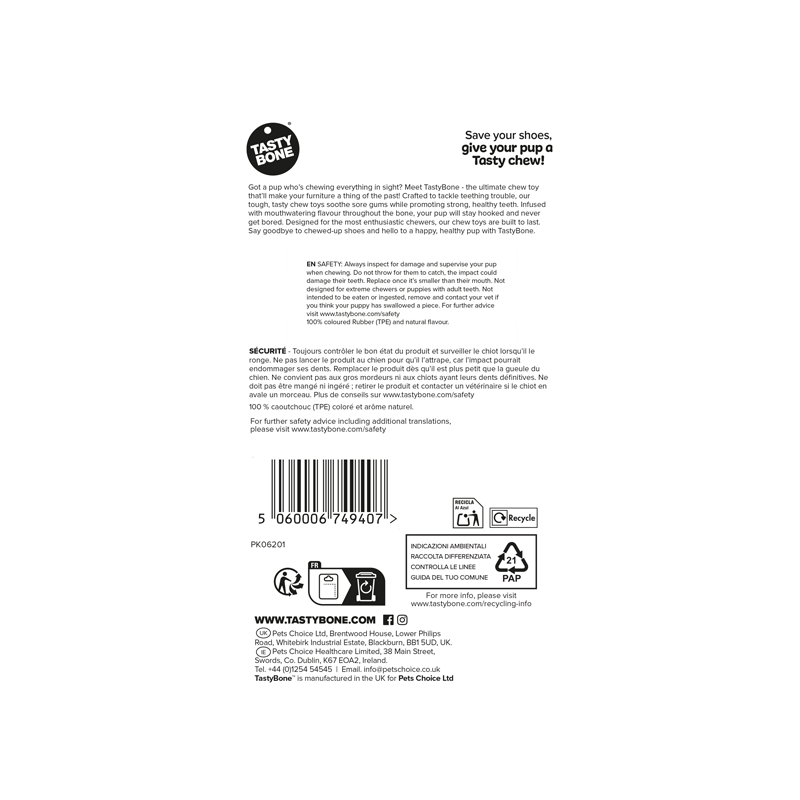 At TastyBone, your pup's safety is our priority. Whether they're a tiny nibbler or a mighty chomper, always pick a chew that's bigger than their mouth. Got multiple pups? Go big to suit the largest pup! Do not throw for your pup to catch, the impact could damage their teeth. Inspect for your TastyBone prior to giving to your pup, check frequently to ensure it is whole and intact. TastyBones are for fun, not food, so keep an eye on your furry friend while they chew. Once it's smaller than their mouth, it's time for a fresh TastyBone… happy chewing!