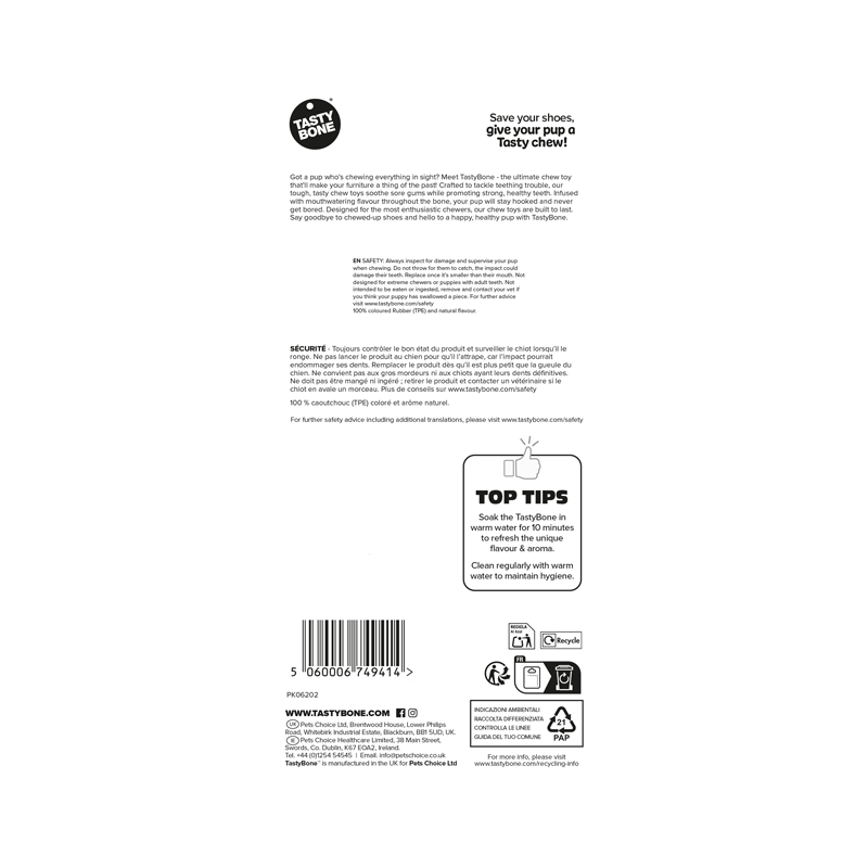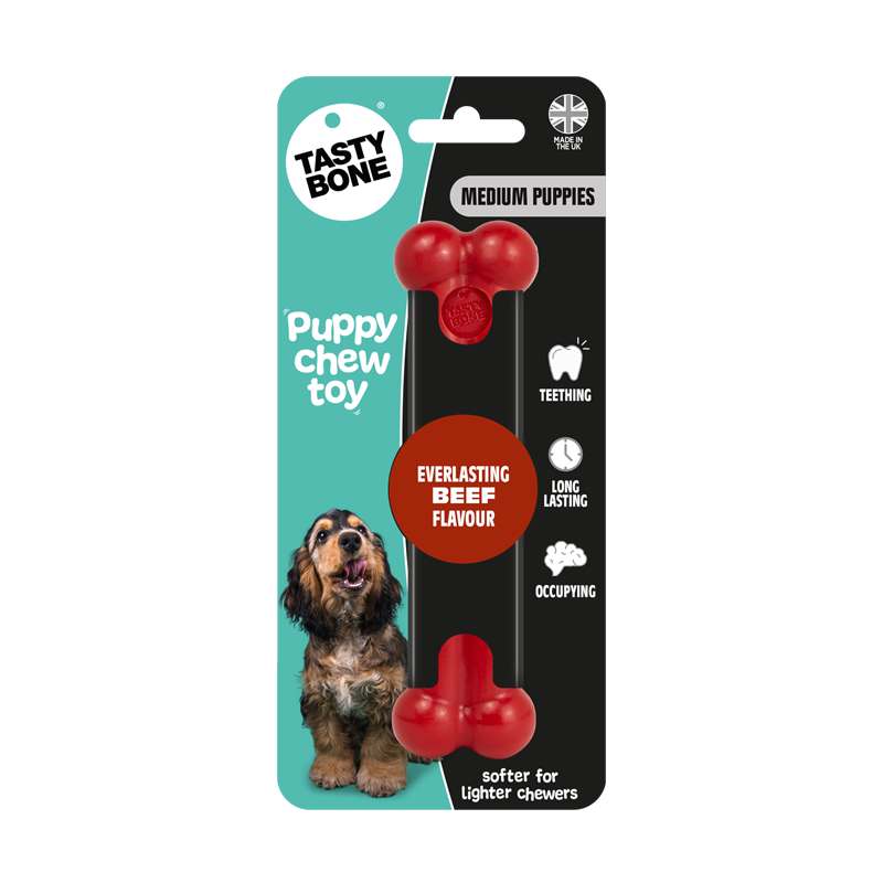 Top Tip! Soak the TastyBone in warm water for 10 minutes to refresh the unique flavour & aroma. Say goodbye to chewed-up shoes and hello to a happy, healthy pup with TastyBone. Ready to level up? Shop our Adult Range of chew toys.